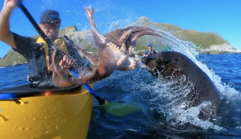 Kyle Mulinder kikajakozott a haverjaival, Taijo Maszuda egy GoPro HERO7 kamerával rögzítette, ahogy egy tréfás kedvű fóka váratlanul simán hozzábassza kajaktársához a méretes polipot.