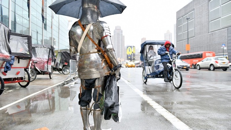 A címlapos bús képú lovagot teljes felszerelésben a rendezvény épülete előtt kapták le, talán nem rozsdált be várakozás közben.