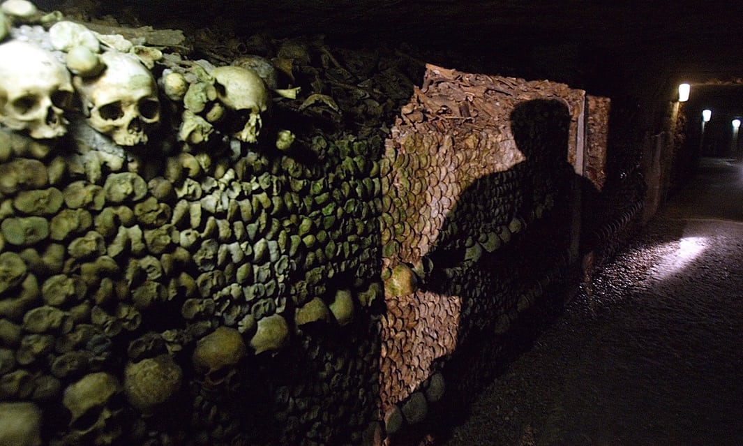 Ez a kedélyes, mintegy 300 km hosszú alagútrendszer egy kőbányából lett kialakítva. A tizennyolcadik század második felében, amikorra Párizs már nagyon terjeszkedni kezdett, zsúfolttá váltak a köztemetők, és a halottak súlyos egészségügyi kockázatot jelentettek, ezért aztán szépen lehordták őket ide, mintegy hatmillió ember maradványait, szóval a dolog eltarthatott egy darabig. A csontokat szépen elrendezték, és bájos díszítőelemként koponyákat helyeztek el közéjük.