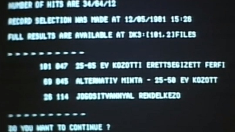 Hogy mégis honnan ismeri Buksiék gombelemekkel seftelő bandáját, homályban marad. Amúgy is jellemző a műre a meg nem magyarázás, hogy ez elidegenítő hatás akar lenni vagy szimplán a forgatókönyv ügyetlensége, szintén nem derült ki, legalábbis nem bírtam megállapítani. Az egyik napról a másikra duplacsavaros műkincsrablásokat a kisujjából kirázó ötletgazda az első pár akció profitjából videókamerát vesz, ezt nemtörődöm passzióval a lábával pöckölgetve veszi fel a kietlen szoci utcaképeket, de a technika a konspiráció eszközéül is szolgál. A fenti duplacsavar: a nyugatnémet kapitalista ikonsefteseket (köztük Virág doktor, azaz Kézdy György derrickes kiejtéssel) közúti balesetbe csalva a banda visszalopja a képet, sőt vissza is csempészi a helyére a templomba, a pénz pedig náluk marad – úgy látszik, CST azt is kiszámolta előre, hogy a letakart tábla mellett a kanyarban elszálló kocsiban mindenki pont meghal, a kép viszont sértetlen marad. Péter el nem kötelezett, azaz a korszakban szinte előírt nyugati megbízók (a szocialista embertípus nem bűnözik, max. kicsiben) mellett hazai gyár széfjét is felnyomja a munkatársaival. Köztük megtalálható Szakáll, mindannyiunk Szamócája (Eperjes Károly) tényleg szakállal, sőt a fiatal Bajor Imre, “Dzsipes” is, bajusz nélkül és utószinkronizálva, ő a dzsipje alatt ér rossz véget a kiszállással fenyegetőzései miatt. Mindezek az absztrakt bűntények az időszak hangulatfilmjeinek elvárt elemeivel váltakoznak, azaz van nagyon művészi proletárpornó (a társadalmi osztály értelmében), málló vakolat a kocsmában és Münkenben jó pénzért élőképezni vágyó szőke nőcske. A sátáni szervezés tényleg összezavarhatta a nyomozó szerveket, a bűnüldözés ugyanis annyiból áll, hogy a központ folyosóján öltönyös elvtársak vetik oda a “számítógépeseknek” újra és újra, hogy szűkítsék a keresést! Biztos szűkül, bár ezt is bemondásra kell elhinnünk. A befejezetlenség a le nem zárásban is ott van, Péter/CST félig elmosódott arca üvegen tükröződve, szabadlábon. Mi jut még eszedbe a kirakatrendezésről? (Online itt látható, orosz megosztón, de ez senkit ne tántorítson el.)