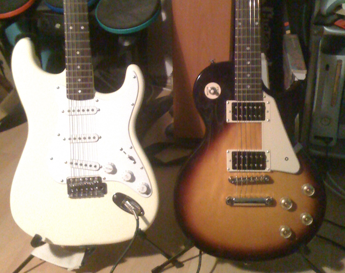 Ezek egyébként a gitárok nálunk háztartási szinten. Egy Stratocaster és egy Les Paul. Szerintem minden háztartásba kell gitár, akkor is ha nem tudunk gitározni. Az esztétikája elég szép és gitározni még a fakezűek is meg tudnak tanulni addig, hogy “sálllááááááálááááá”. A sunburst Les Paul az enyém.