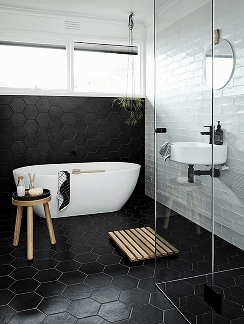 Természetesen nem törünk pálcát, a dizájn az dizájn. Hatszögletű csempét rakni üvegfalú zuhanykabin mellé nagyjából mindenki rémálma, aki látott már közelről bármi olyat, ahol ember mossa a hátát a zuhanyrózsába énekelve a Bohemian Rhaprsody-t. Szerencsére ez legalább nem kötelező.