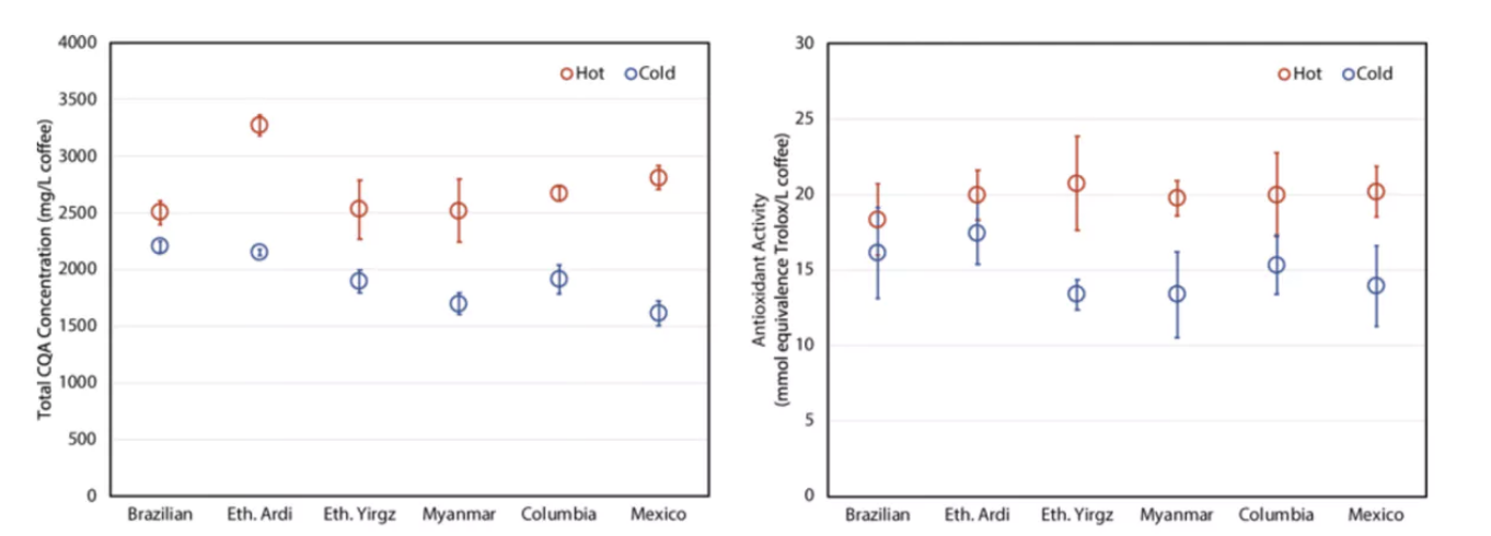 A másik, hogy a hosszú ideig hidegen áztatott kávéban több marad az antioxidáns, mert azokat a forró víz tönkreteheti. Ez is teljesen tévesnek bizonyult. Megmérték a különböző módon készült kávék CQA (caffeoylquinic acid isomers) tartalmát, a forró kávék kivétel nélkül magasabb antioxidáns szintet mutattak (piros jelzések a diagramokon).