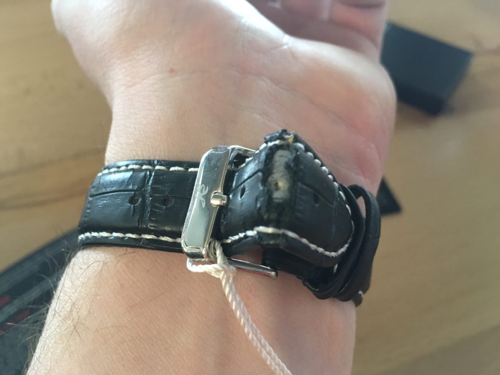 A Genuine Leather óraszíjjal sajnálatos baleset történt a második használat során: az általam csak hibrid-bőrnek hívott megoldás sajnálatos, idő előtti patinát vett fel, ezért elsőre azt gondoltam, hogy gyorsan érvényesítem a garanciát a helyi szervizben. Azon is gondolkoztam, hogy mivel a hibrid-bőr nem csak hogy nem tűnik kimondottan tartósnak, emellett még elképesztően, rettentően kurva büdös is. Avatatlan orr a kínai fröccsöntött játékok szagát vélné felismerni a szíjban, de az igazság az, hogy sokkal inkább salétromos-föld illatok dominálnak benne. Mindenesetre nem az én ízlésem, elképzelhető, hogy cserélni fogom.
