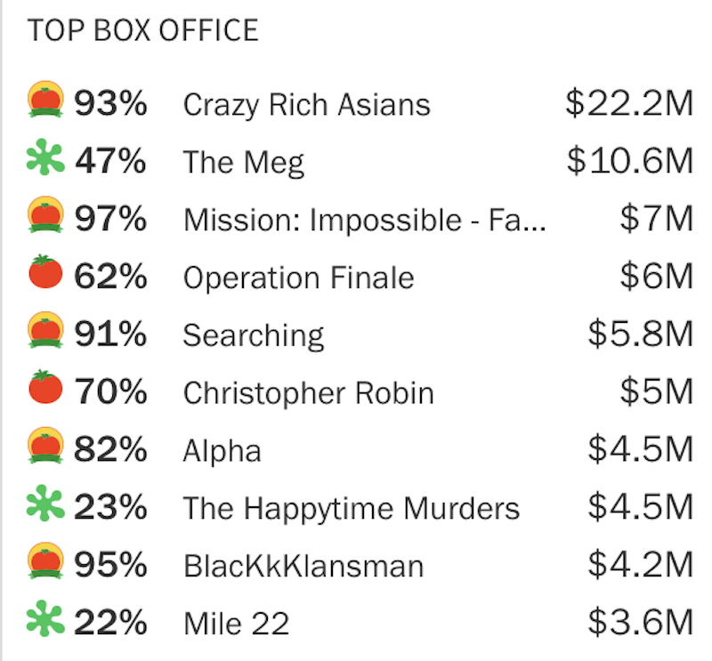 Miért mérvadó a Rottentomatoes? Mert nem csak szemlézik a filmeket, hanem az olvasói értékelések mellett követik a valós értékesítési adatokat is, így néz ki a heti top csárt a jegyeladásokból (box office).