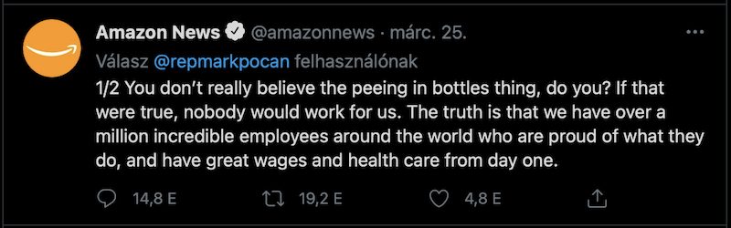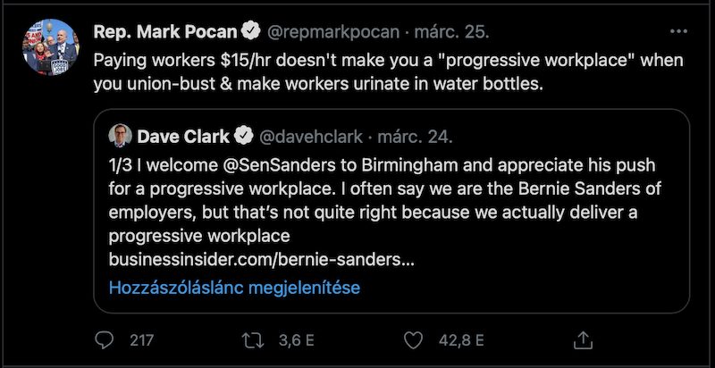 Pocan szenátor tehát korunk hivatalos kommunikációs csatornáján, a Twitteren kérdezett rá a magát a dolgozók progresszív mekkájaként aposztrofáló, Bernie Sanderssel példálózó vállalatra, hogy ha minden annyira csodás, akkor miért törik le sorozatosan a szakszervezeti törekvéseket és miért kénytelenek a dolgozók vizes palackba üríteni a hólyagjaik tartalmát?