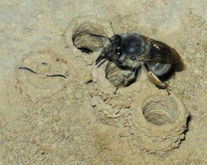 A másik szakmunkás méhcsoport a kőműves méheké. Brehm szerint a pöszörőkhöz hasonlítanak, de én a pöszörőt csak fütyi jelentésben ismerem és nem valószínű, hogy ezek a méhek egy kis pöcsre emlékeztetnének, úgyhogy várom a további megfejtéseket. A kőműves méhek is fali lyukakba vagy földbe fészkelnek, és csak kicsit magányosak, mert többen is használják ugyanazt a fészkelőhelyet. Akkor aztán úgy néz ki a környék, mint egy mini holdkráter-telep homokból és sárból.