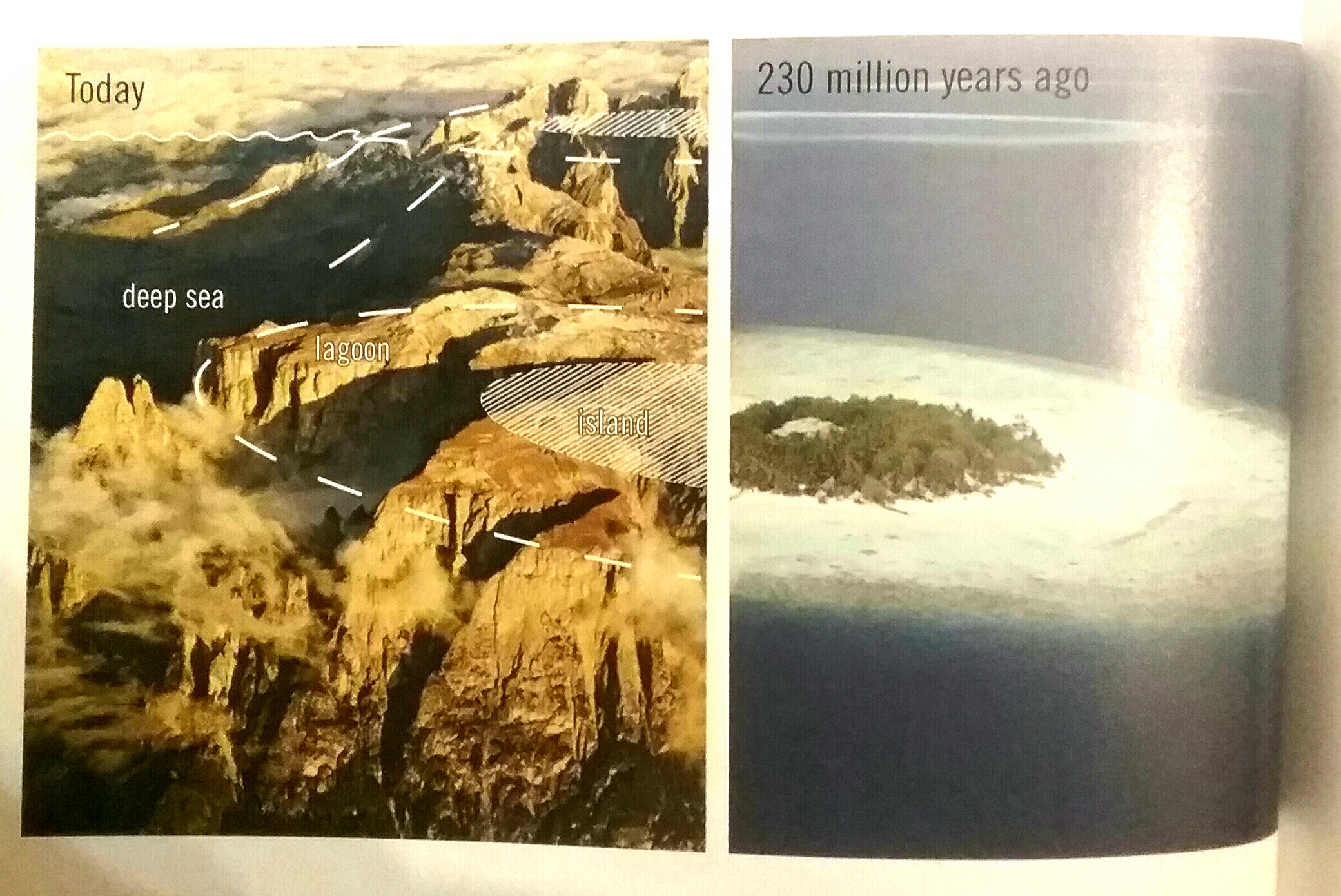 Amit tudni kell a Dolomitokról, hogy bár napjainkban hegyek, valamikor régen a Tethis őstenger korallzátonyai voltak. Trópusi éghajlat uralkodott akkoriban, s amit ma Déltirol néven ismerünk, annak nagy része a vízfelszín alatt volt.