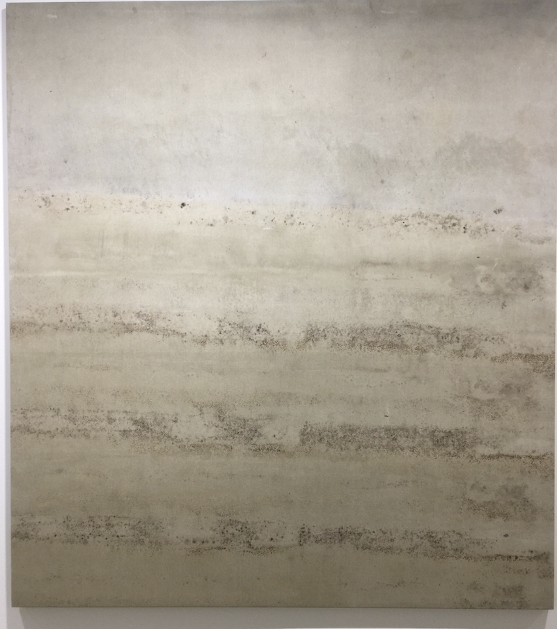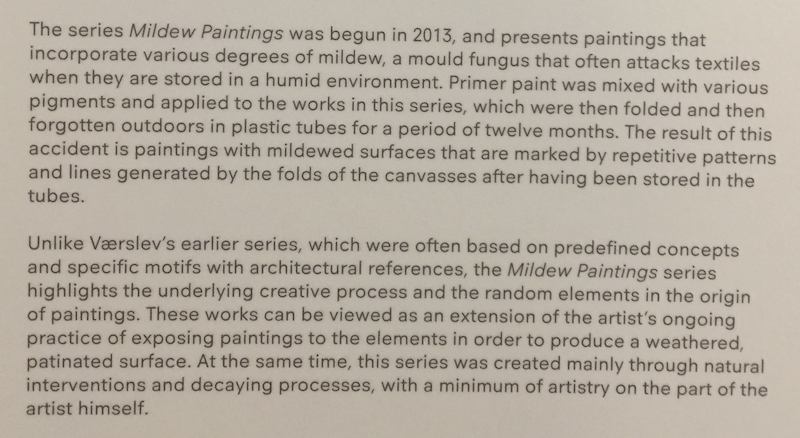 Fogott ezért néhány vásznat, összehajtogatta, összetekerte, majd nedves környezetben hagyta, hogy a spórák nekiálljanak és színek valamint formák megvadult kavalkádjával kápráztassák el. Aztán felfeszítette 220x196x4 centis fakeretre az önálló pályaműveket.