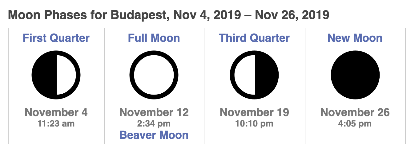 A poszt írásakor 99,3% a holdtölte, az égre feltekintve kelet-délkelet felől látható, szerencsére a felhőzet hiánya teljes valójában mutatja meg a novemberi Hódunkat. A 100% kedd kora délutánra várható.