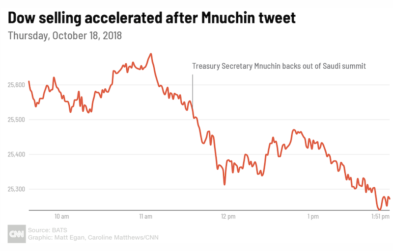 A Dow, Nasdaq esése mögött Steven Munchin előadása állhat, szaúdi bejelentései kissé meglepték a teljes tech piacot, a Netflix 5%-ot zuhant, az Amazon és a Facebook is rögtön 3 százalékot bukott.
