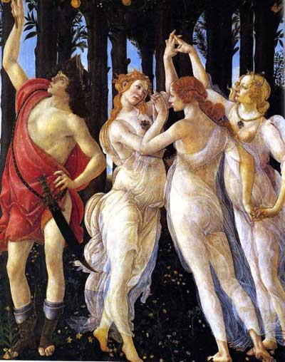 Középen Vénusz áll, a szerelem és a szépség istennője, mellette a három ledér leány pedig a három nimfa.
