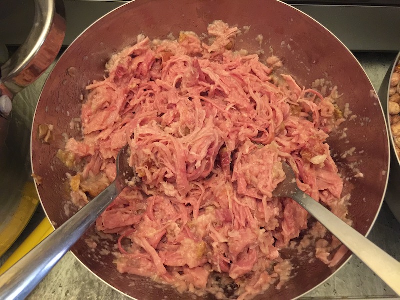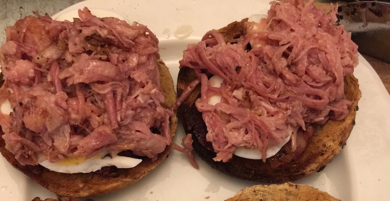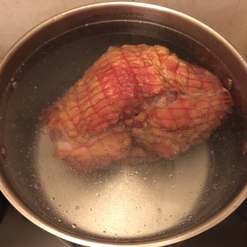 Ennyi bevezető után mostanra vélhetőleg mindenki szájában összefutott a nyál, úgyhogy lássunk is neki a munkadarab szakszerű előkészítésének és a felhasználás előtti napon helyezzük egy fazék hideg vízbe és felejtkezzünk is el róla reggelig. Ennek a műveletnek az a célja, hogy megszabaduljunk a só egy részétől és ha nem tennénk, ehetetlen lenne a végeredmény – épp ahogy a sóher rokonainknál megszoktuk a pálinkás vendégváró mellé felszolgált “sonkától”.