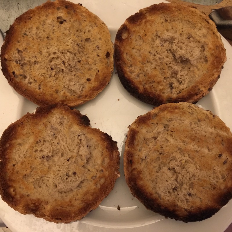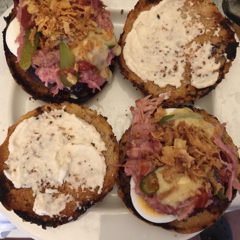 Vegyünk először sokmagvas zsemlét és pirítsuk meg. Használhatnánk akár szezámmagos hamburger bucit is, azonban a szép idő és a hosszú hétvége hatására ezt felvásárolták, úgyhogy ezúttal a közért burgerzsemle polcai üres kongással jelezték, hogy másba kell kerüljön a pork.