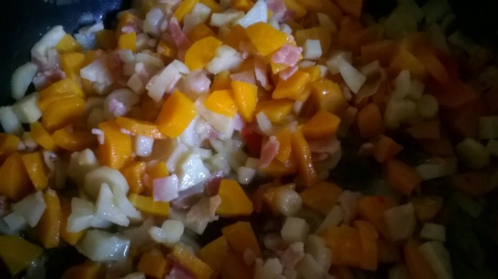 Egy nagyon finom, de egyszerű zöldséges alapot fogunk készíteni, ezért rögtön vegyünk is elő némi szalonnát! Legjobb a füstölt kolozsvári, vagy – végső elkeseredésben – egy kis bacon. Érdekes, hogy ezek a mai békönök nem is elég sósak, nem is elég füstöltek és általában is valahogy vizesebbek, mint kellene, tehát nem véletlenül ragaszkodom a kolozsvárihoz (csak füstölt legyen, ne füstölt-főtt!). Pirítsátok meg pici olajon vagy zsíron (ki mit szeret használni), és dobjatok rá egy fej felkockázott vöröshagymát, majd pár gerezd szétnyomott fokhagymát. Erre fogunk majd a továbbiakban építkezni.