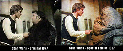 Ez utóbbi igazából kényszermegoldás volt: az eredetileg leforgatott jelenetben Harrison Ford körbe sétálva elhaladt a Jabbát alakító színész, Declan Mulholland háta mögött. Igen ám, de Mulholland ember volt, míg a Lucas által újraálmodott Jabba egy óriási slug (vagyis meztelencsiga), és mivel a Hutt figura megalkotása után ott a farok helyének kellett lennie, Harrison Fordot digitális trükkök segítségével „felemelték”, és Jabba reakciójával együtt a farokra lépést rajzolták meg CGI-jal. Az eredeti, 1977-es jelenettel szemben, ahol Mulholland emberi (Galactic Basic, vagyis Galaktikus Közös) nyelven beszél, a 97-es jelenet CGI-karaktere már ugyanúgy hutt nyelven tárgyal, ahogy a Jedi visszatérben, s mindez angol feliratozással ellátva.