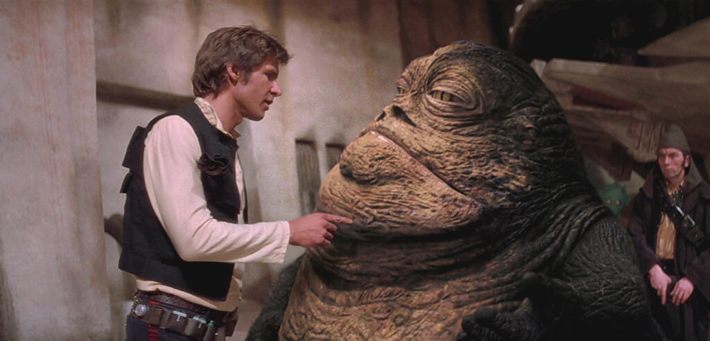 Han Solo, és az eredeti Jabba – illetve ugyanaz a jelenet a későbbi, mindenki által ismert CGI Jabba-verzióval.