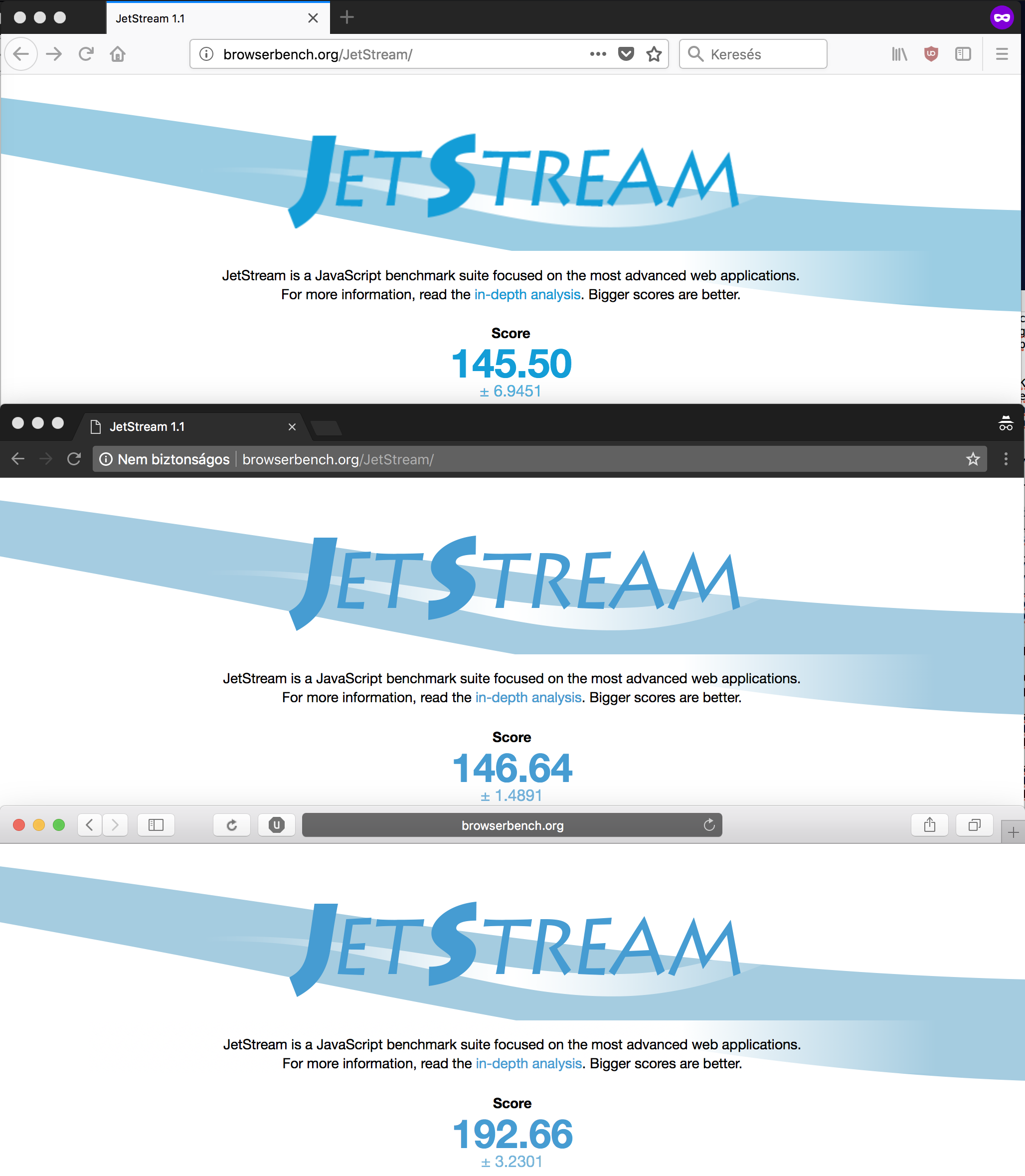 Felülről lefele Firefox, Chrome, Safari, a nagyobb pontszám a jobb: