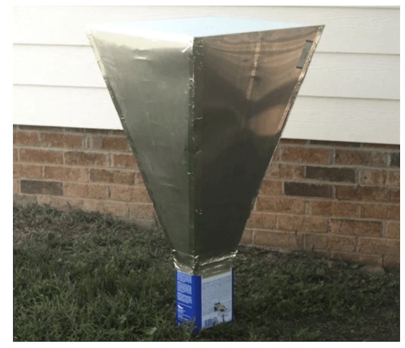 David ugyanis csak fogott egy kiürült hígítós kannát, fabrikált rá egy ernyőt tölcsérnek, belevágott a hullámhossznak megfelelően méretre egy koaxiális kábelt és a egészet egy USB vevőn vezette át a számítógépére.