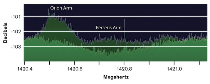 Jól kivehetők az IEEE spektrumban az Orion és a Perseus, a Tejút spirálkarjai más-más frekvenciákon figyelhetők meg, a háttérsugárzásból kiemelkednek a színképvonalaik.