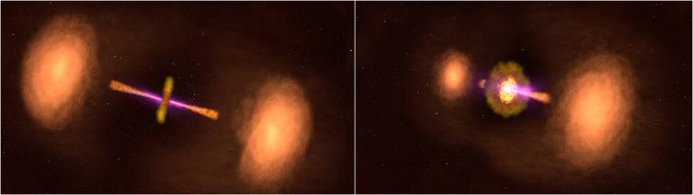 Az elnyújtott forma magyarázata pedig az, hogy a közelében található, a Napnál milliárdszor nagyobb tömegű fekete lyuk arra készteti a galaxismagot, hogy lényegében egy tengely mentén, két sugárnyalábban lövellje ki a távozni kényszerülő anyagot, ami így szárnyakra emlékeztető formákat képez az ütközések után.