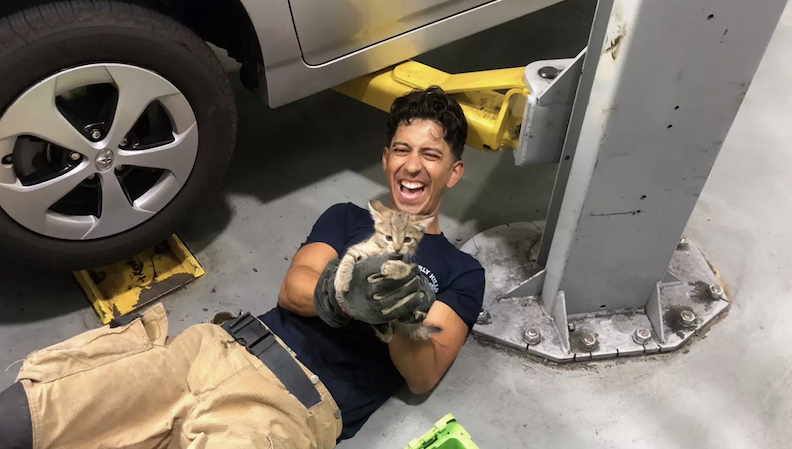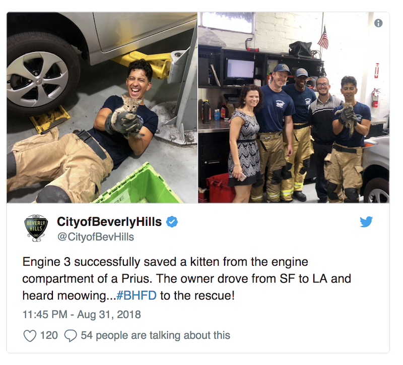A Beverly Hills Fire Department szakértőihez fordult a géptető alól fura, nyávogó hangokat halló tulajdonos, miután megtette a San Francisco-Los Angeles távot.
