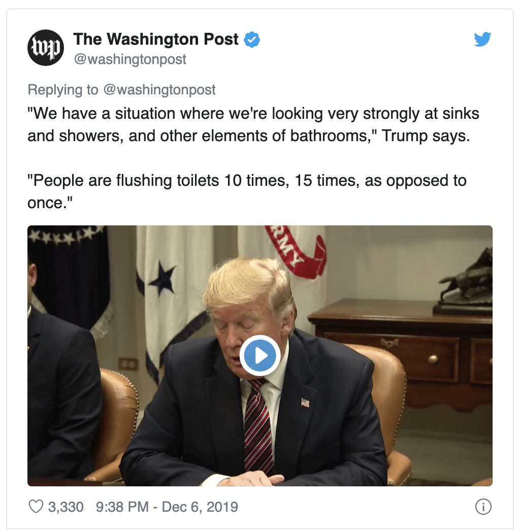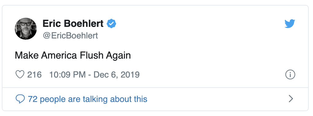 Az elnök szerint a népek egyetlen kiadósabb trónolás után tíz-tizenöt alkalommal is kénytelenek lehúzni a klotyót az eredményért ahelyett, hogy egyszer rendesen megkínálnák öblítővízzel. Ideje, hogy ezzel foglalkozzanak az EPA állami bürokratái és tegyék végre rendbe a fürdőszobai ügyeket.